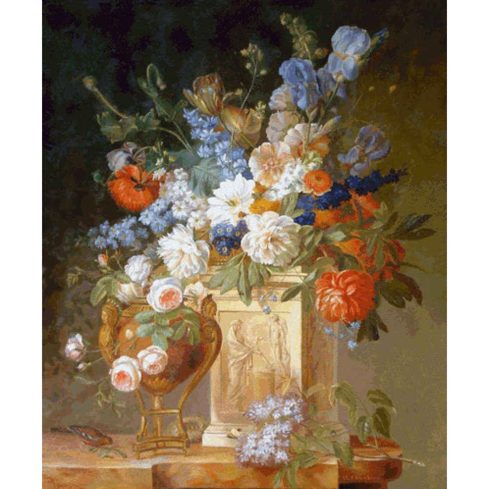 An arrangement of poppies, roses, irises, lilacs, and other flowers on a column with a classical design, spilling over into an urn.  This pattern is solidly stitched. Any color fabric may be used.