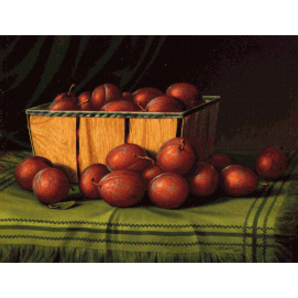 A still life of a chipboard basket filled with red plums, resting on a green fringed cloth.  More plums surround the basket.  (1898) .  This pattern is solidly stitched. Any color fabric may be used.
