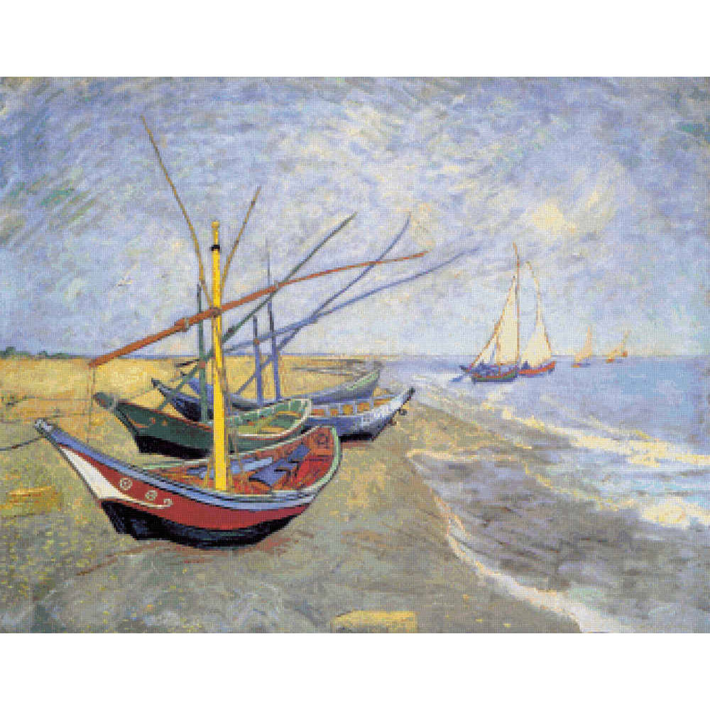 Several brightly and ornately painted sailboats drawn up onto a sandy beach out of the reach of the breaking waves.  Not far offshore, several more sailboats seem to be beating against the wind which is almost palpable in the brush strokes used for the sky.  (Post-Impressionist, 1888) This pattern is solidly stitched. Any color fabric may be used.