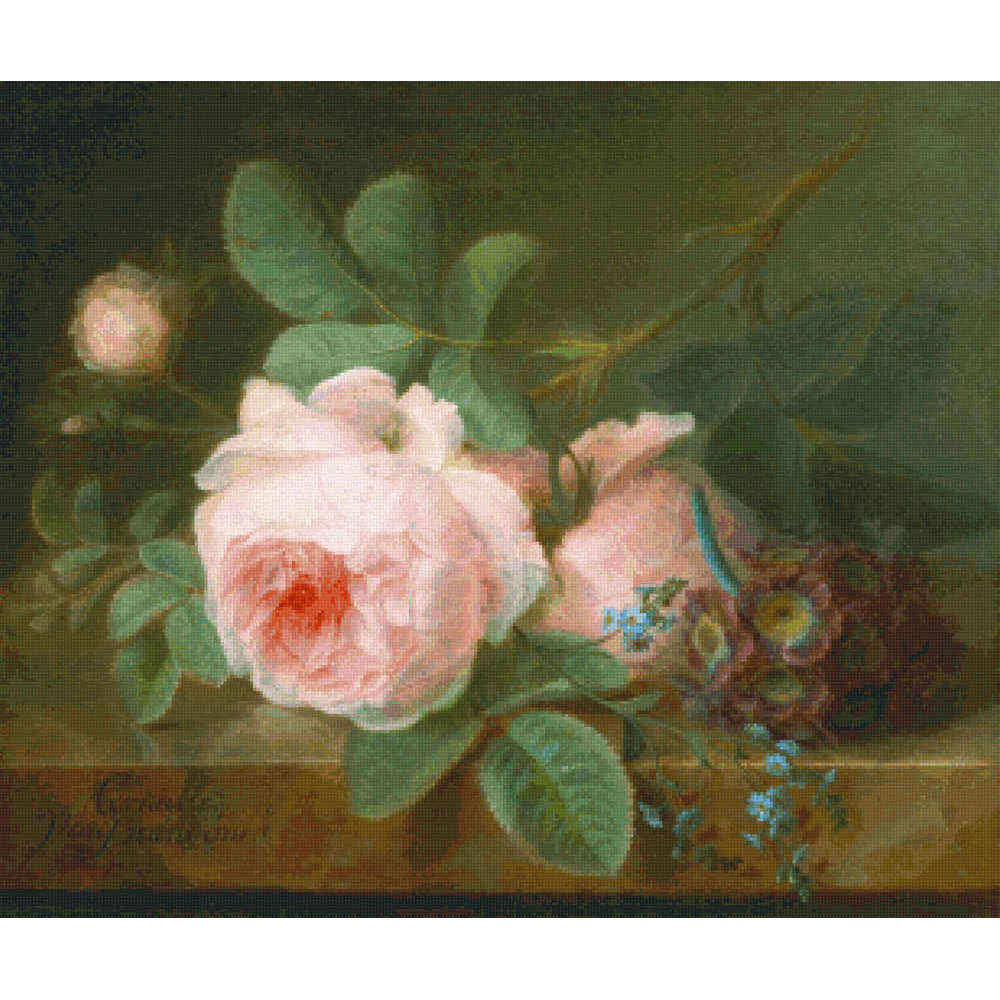 A stem of pink cabbage roses, two open and one in bud, lying on a marble slab.  A bunch of primroses lies next to them, with a spray of forget-me-nots. This pattern is solidly stitched. Any color fabric may be used.