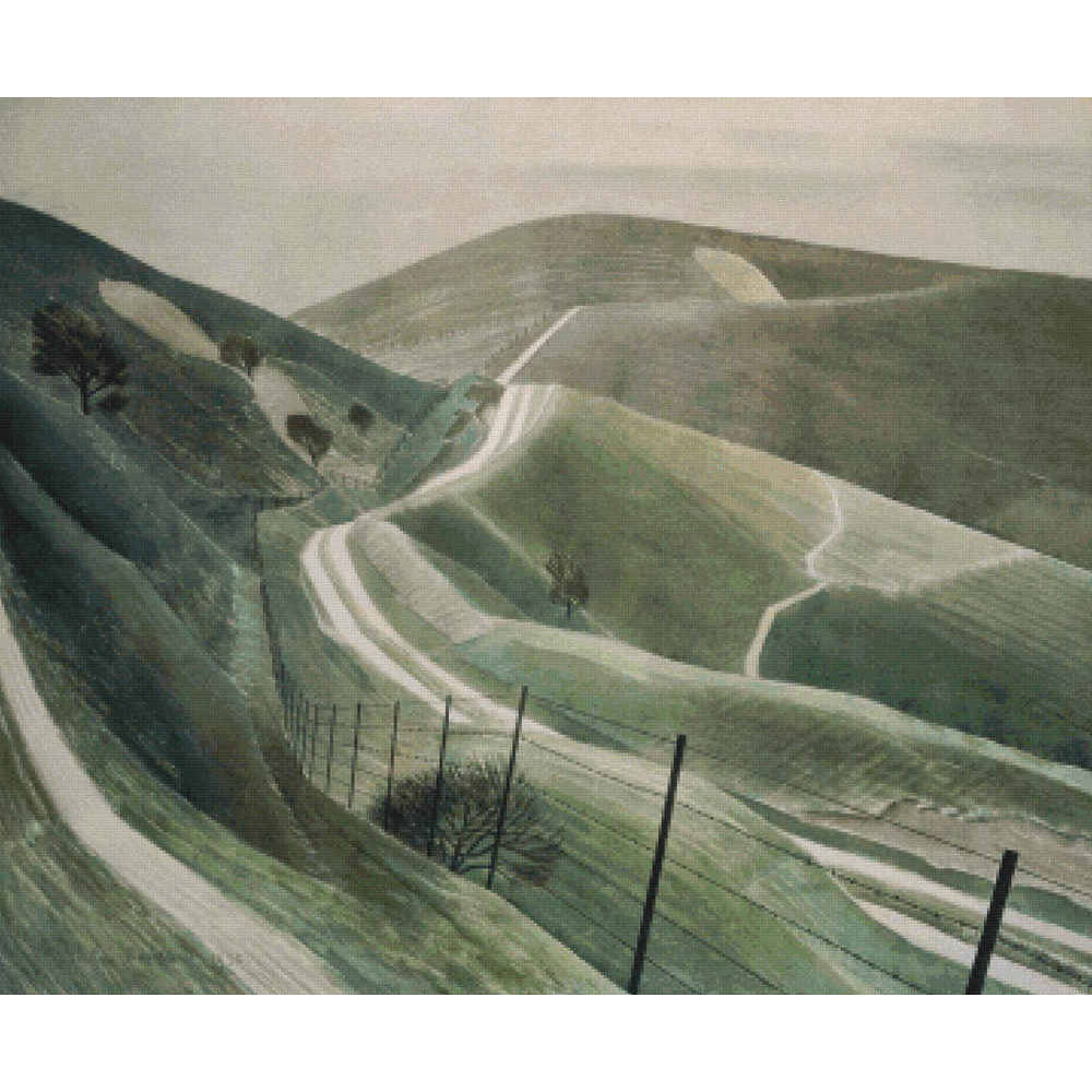 A view of the chalk hills of the South Downs in Sussex, England.  Paths worn in the thin grass expose the white chalk.  A barbed wire fence frames the scene, and the hills seem to fade into the gray sky.  (1935).  This pattern is solidly stitched. Any color fabric may be used.