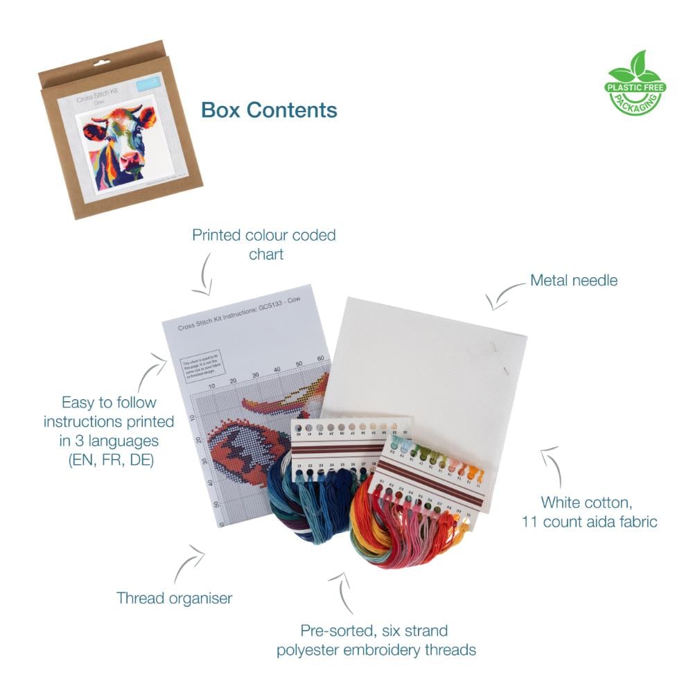 • Kit includes: white, cotton, 11 count, aida fabric; 6 strand polyester embroidery thread; needle; colour coded design and instructions in 6 languages (ENG,FR,DE,ES,IT,NL).