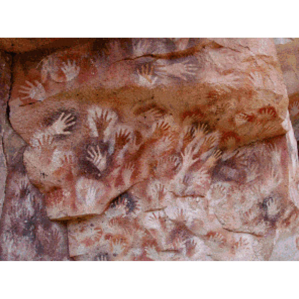 Hand silhouettes from a cave in Argentina, spray-painted using bone tubes.  (About 7300 BC.).  This pattern is solidly stitched. Any color fabric may be used.