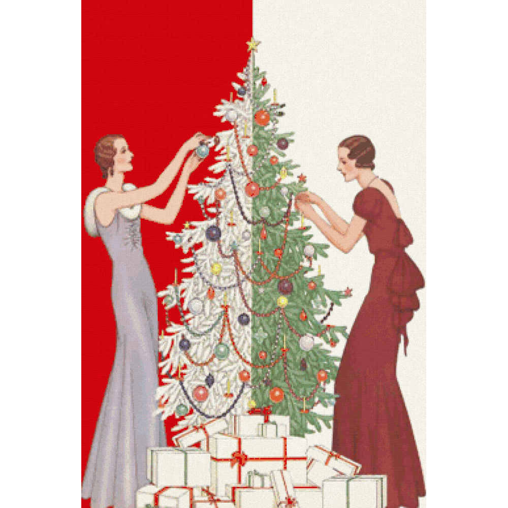 Two art deco ladies trimming a bi-colored Christmas tree.  One, wearing a lavender gown with a fur collar against a red background, is trimming a white tree; the other, in a dark red gown against an off-white background, is trimming a green tree.  This pattern can be stitched on red or off-white fabric.  If red fabric is used, only the off-white side is stitched, and vice-versa. (About 1925)