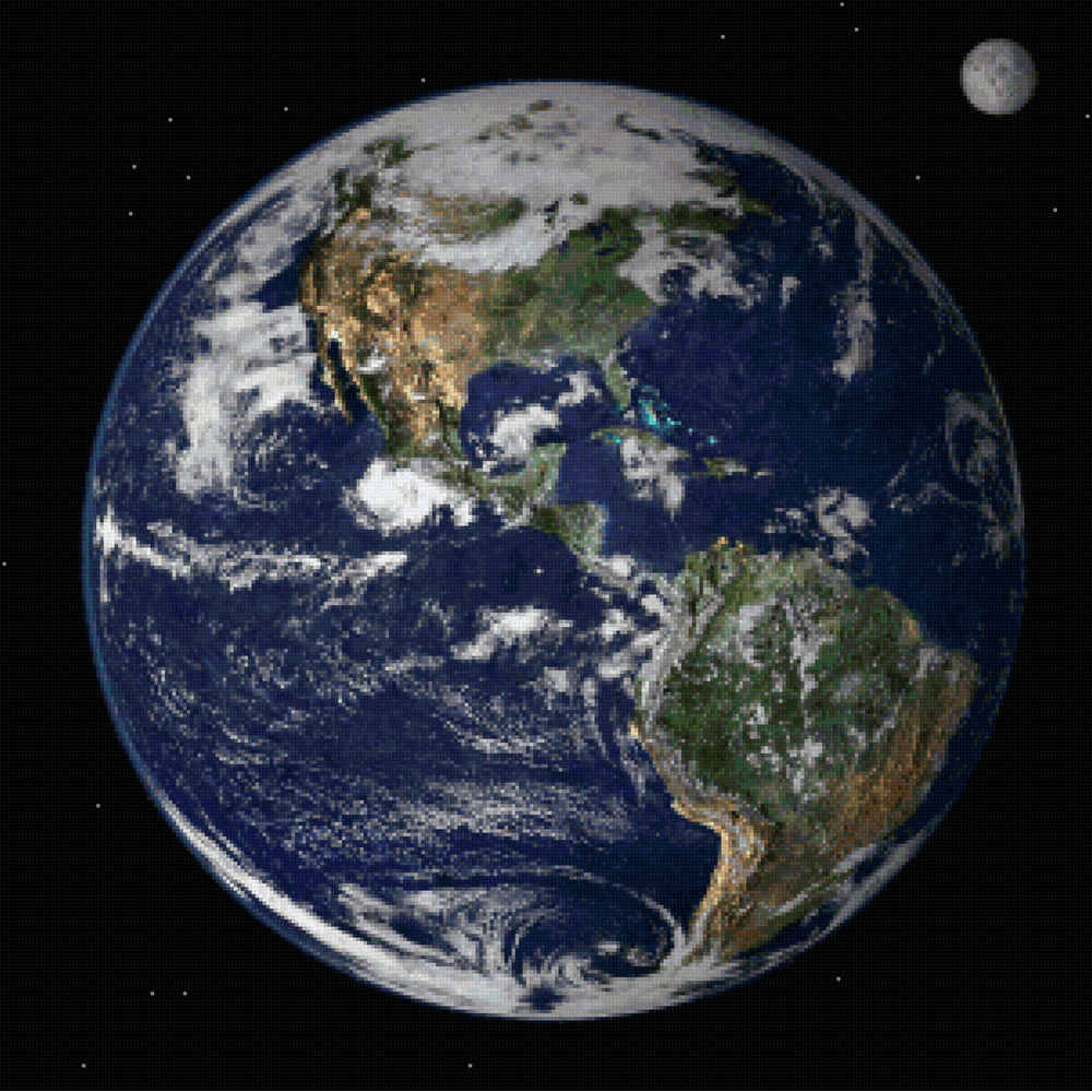 Planet Earth and the moon from 22,000 miles out in space.  North and South America are seen through light swirling clouds with green lowlands and rocky mountains.  The moon is far behind the earth and a few scattered stars can also be seen.  This pattern is based on a composite photograph produced from imagery from two satellites.  The background is not stitched; use black fabric. The moon and/or stars may be omitted.  (2000)