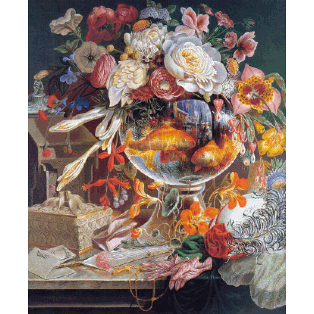 A classic still life with some twists!  A glass vase containing a lavish bouquet of roses, petunias, delphiniums, bleeding hearts, coral honeysuckle, and other flowers — but the bowl also contains a couple of goldfish, and reflects people walking along a village street.  On the table beside the vase are nasturtium flowers, a feather, pink kid gloves, a fan, a lace hanky, a letter, a gold cross on a chain, a keepsake box with two doves on the lid, and a small wooden cupboard. (American, 1867) This pattern is solidly stitched. Any color fabric may be used.