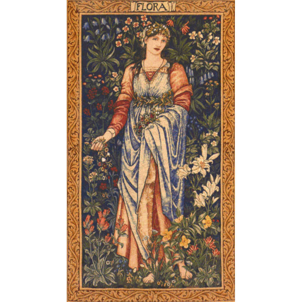 The Roman goddess Flora, goddess of flowers and spring, on a dark gray-blue background with an abundance of different flowers.  She is wearing a rose gown with a blue kirtle over it, has a garland of flowers in her hair, and holds more flowers in her hand.  The border is of gold acanthus leaves with the label “Flora” at the top.  This is based on a wool and silk tapestry produced by William Morris & Co.  The figure is by Burne-Jones but the floral ground and border is by J. H. Dearle. (1885) This pattern is solidly stitched. Any color fabric may be used.