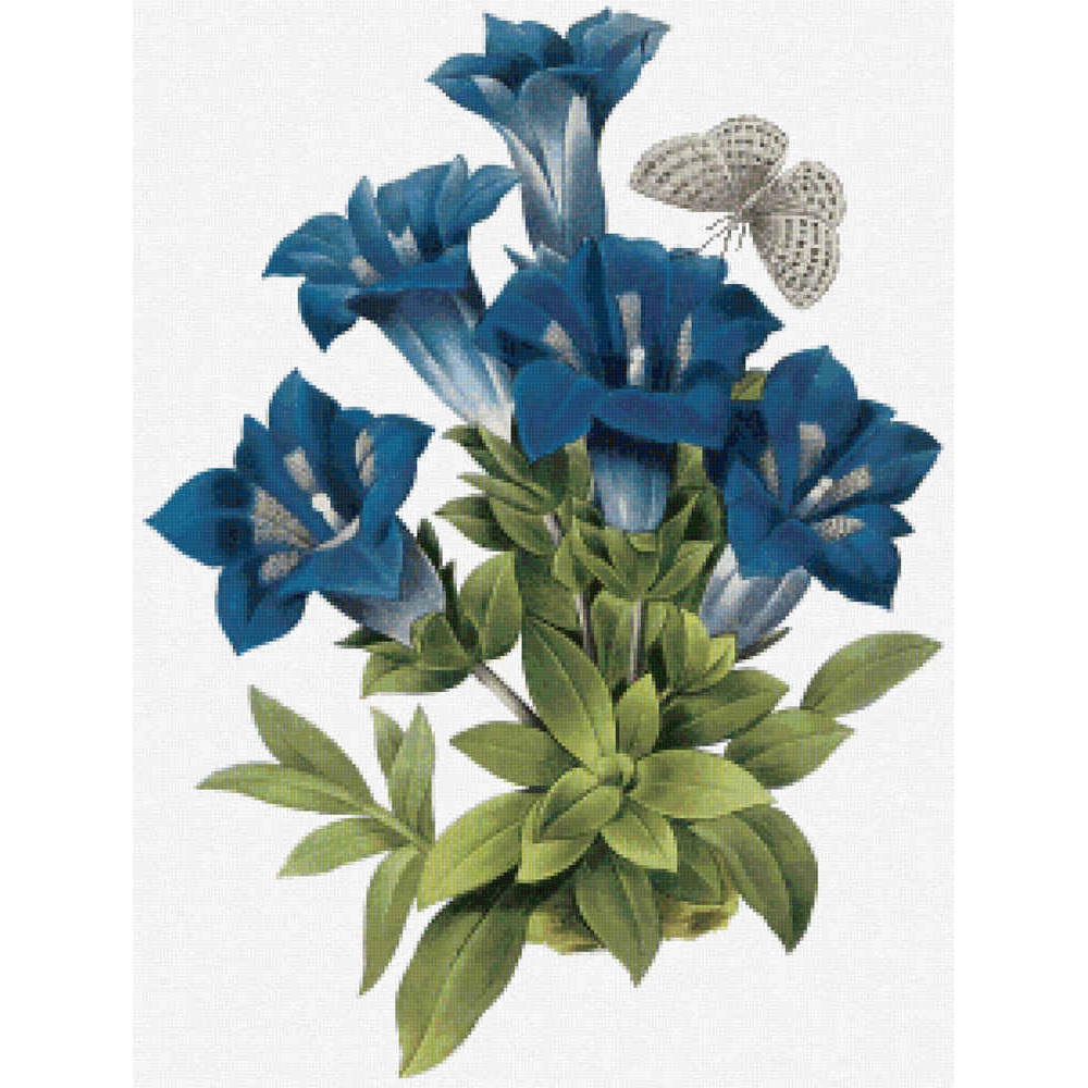 A botanical print of a stemless gentian, native to the mountains of Europe.  The flowers are deep blue, with spotted stripes inside, and the leaves are smooth.  A small butterfly is hovering above the flowers.  The background is not stitched.  Use white fabric.