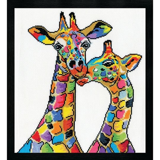This counted cross stitch picture kit from Design Works Crafts, features a pair of giraffes in bright bold colours.