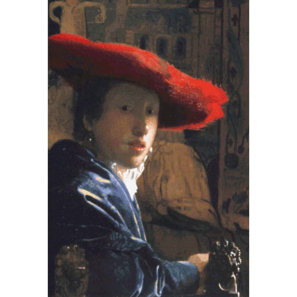 A young woman wearing a bright red furry hat and a blue brocade jacket.  She is seated in a carved chair before a tapestry hanging on the wall.  Her face is deeply shaded by the hat. (1665-7).  This pattern is solidly stitched. Any color fabric may be used.