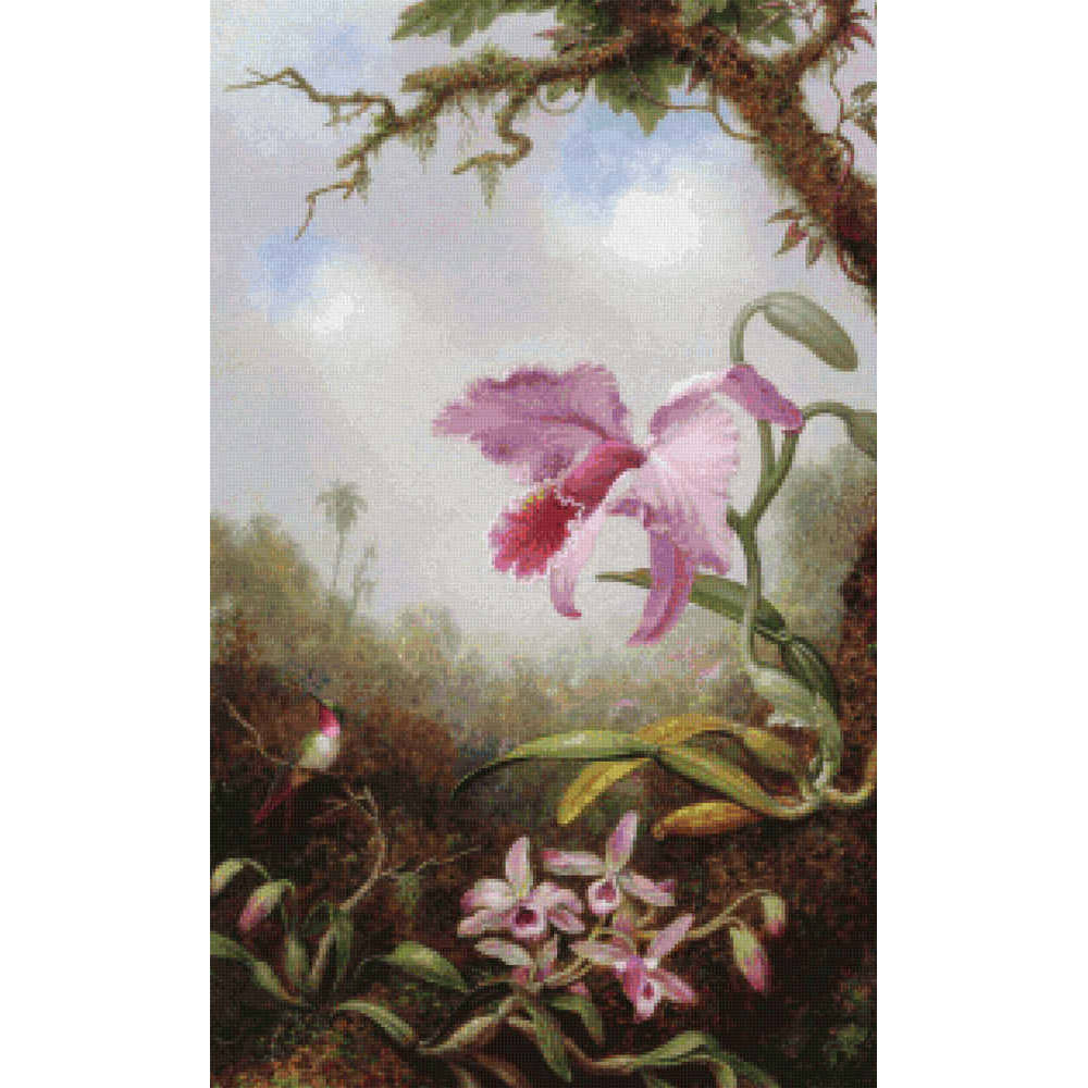 A pink and green hummingbird in a tropical forest, perched on a twig near a large Cattleya orchid and a few smaller orchids.  A branch festooned with moss frames the scene.  In the background, palm trees can be seen dimly through the mist, and the sun is struggling to break through.  (About 1890-1904).  This pattern is solidly stitched. Any color fabric may be used.