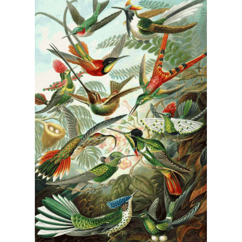 A collection of mostly South American hummingbirds.  They are (left to right): Row 1 (top) – Ruby-throated hummingbird, Horned sungem.  Row 2 – Crimson topaz (red body).  Row 3 – Tufted coquette (pink crest), Sword-billed hummingbird, Red-tailed comet (forked tail).  Row 4 – Buff-tailed sicklebill, White-vented violetear (pink neck, yellow shoulders), Hooded visorbearer (black head), Dot-eared coquette (green and yellow dots).  Row 5 – Female Juan Fernandez firecrown (blue crest), White-booted racket-tail (appears to be sitting on eggs, but those are its legs).  All are male except the Juan Fernandez. (1904).  This pattern is solidly stitched. Any color fabric may be used.