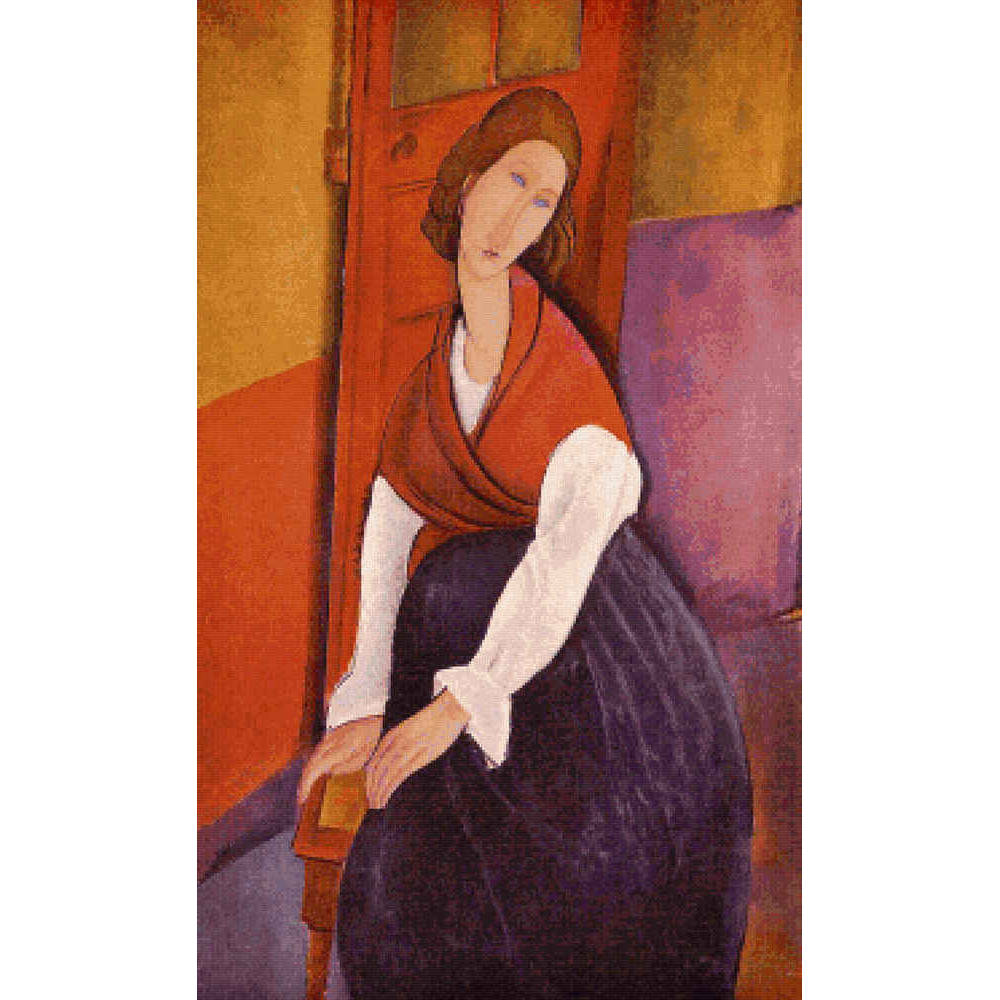 A portrait of the artist’s common-law wife.ย  She is wearing a red shawl over a white blouse and a blue skirt, and is perched on a chair in front of a door (also known as Jeanne Hebuterne in Front of a Door). (Expressionist, 1917).ย  This pattern is solidly stitched. Any color fabric may be used.