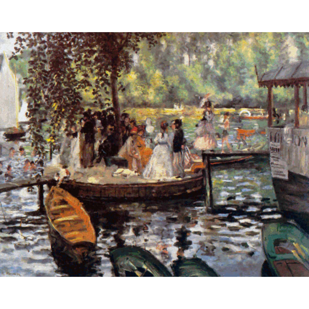 A popular swimming and boating resort on a small branch of the Seine at Croissy.  “The Froggery” was an easy weekend destination because a railroad line (new at the time) ran nearby.  To the right is a floating restaurant.  In the center people are enjoying a mid-water platform in the shade of a tall tree.  The water is busy with rowboats, sailboats, and swimmers, and ripples catch glints of light.  (Impressionist, 1869)  This pattern is solidly stitched. Any color fabric may be used.