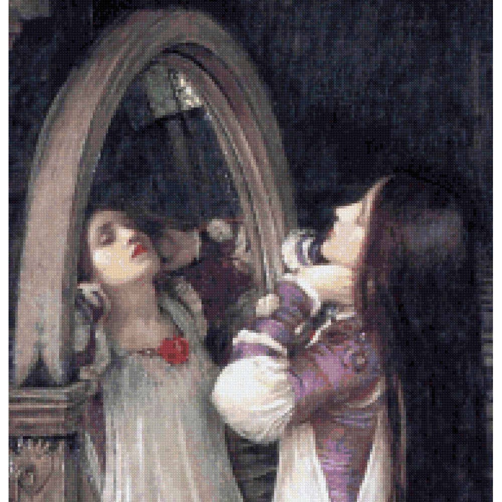 Mariana, her black hair streaming down, gazes mournfully at her reflection in her mirror. Abandoned by her faithless lover, she bewails her lonely fate. “And on the liquid mirror glow’d/ The clear perfection of her face./ ‘Is this the form,’ she made her moan,/ ‘That won his praises night and morn?'” – Alfred Lord Tennyson. This is a detail of the full painting; see WAT010for a pattern of the complete painting.  (Pre-Raphaelite, 1897) This pattern is solidly stitched. Any color fabric may be used.