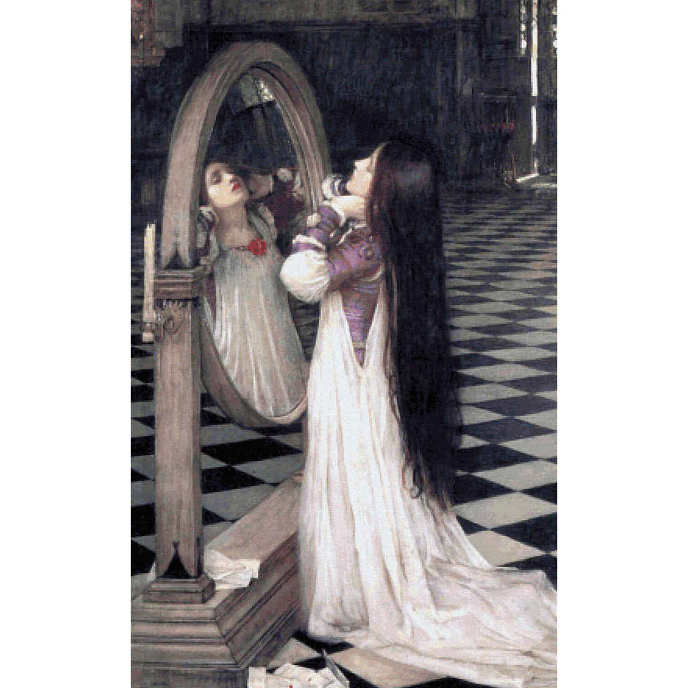 Mariana, her black hair streaming down, kneels before her mirror on the tiled floor.  Her faithless lover’s letters are scattered about, and abandoned by him, she bewails her lonely fate. “And on the liquid mirror glow’d/ The clear perfection of her face./ ‘Is this the form,’ she made her moan,/ ‘That won his praises night and morn?'” – Alfred Lord Tennyson. (Pre-Raphaelite, 1897) This pattern is solidly stitched. Any color fabric may be used.