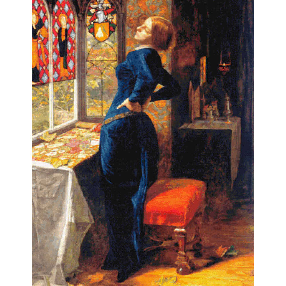 Mariana in a blue velvet gown at her window in the moated grange.  The stained glass is bright but outside the autumn leaves are fading.   She is watching for her lover, whom she no longer believes will come to her. “She only said, ‘My life is dreary,/ He cometh not,’ she said;/ She said, ‘I am aweary, aweary,/ I would that I were dead!'” – Alfred Lord Tennyson. (Pre-Raphaelite, 1851) This pattern is solidly stitched. Any color fabric may be used.