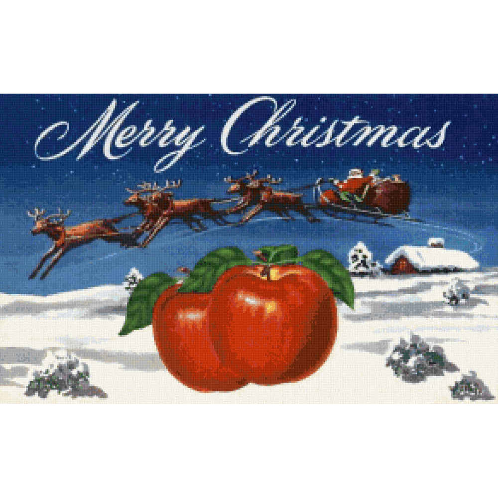 Santa with sleigh and reindeer over a winter landscape featuring a large red apple.  This pattern is solidly stitched. Any color fabric may be used.