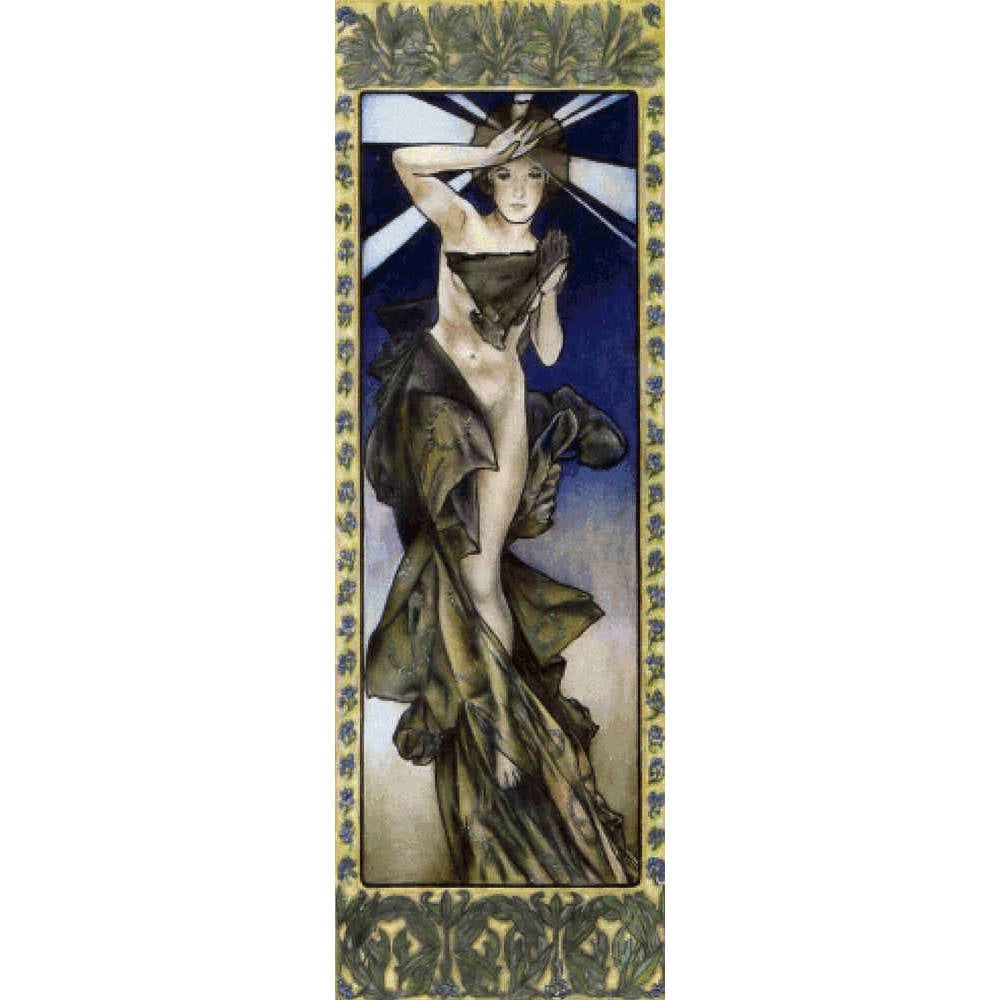 A lady representing the morning star draped in a russet scarf.  Bright rays of light come from behind her head, and below her, day is dawning. A border of flowers surrounds her. We also offer a version without the floral border, as well as the others in the series, The Moon, Pole Star, and Evening Star.  (Art Nouveau, 1902).  This pattern is solidly stitched. Any color fabric may be used.