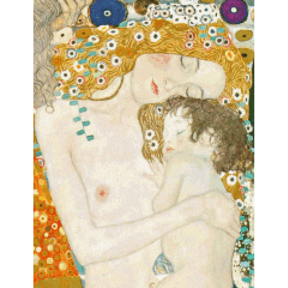A detail from “The Three Ages of Woman” showing a nude young mother holding her sleeping baby.  Her head, with flowing golden hair decorated with flowers and ferns, rests on the baby’s curly brown hair.  The background is abstract dots and circles.  (Art Nouveau, 1905) This pattern is solidly stitched. Any color fabric may be used.