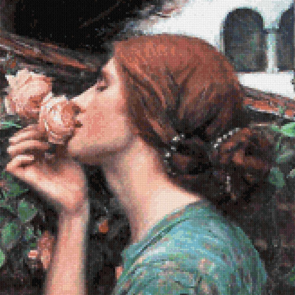A woman in a turquoise silk kimono rapturously smelling a pink rose climbing on a villa wall.  Her auburn hair is dressed with a string of pearls. [Also known as “The Soul of the Rose”.]  This is a detail of the full painting; see WAT011 for a pattern of the complete painting.  (Pre-Raphaelite, 1903) This pattern is solidly stitched. Any color fabric may be used.