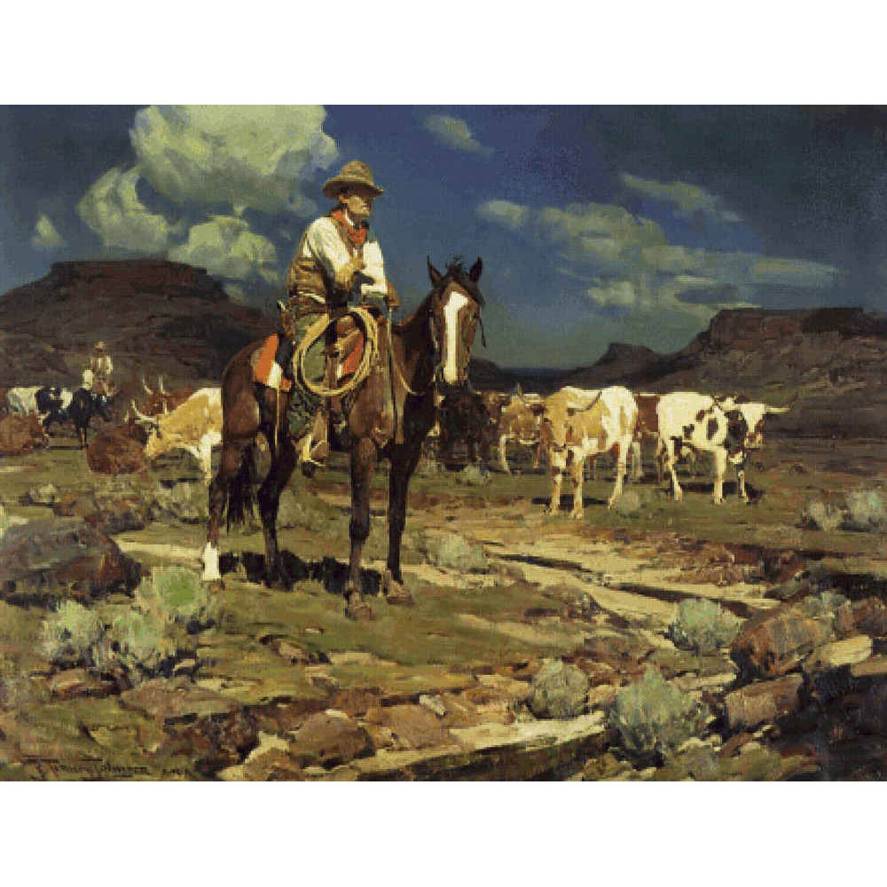 A cowboy on horseback watching a herd of longhorn cattle through the night.  They are on a rocky plateau with little vegetation except some sagebrush.  There are mesas in the background, and another cowboy.  The cowboy is relaxed, smoking with his arms crossed, and is wearing a hat, bandanna, leather vest, chaps, and boots.  We also offer a detail from the painting showing just the cowboy and horse.  See JOH002-D. (1936) This pattern is solidly stitched. Any color fabric may be used.