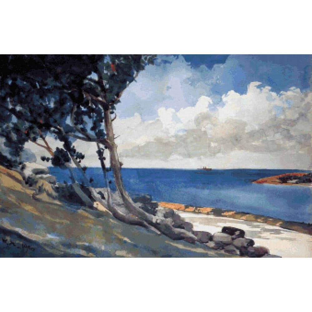 A view of the sea off the north shore of Bermuda.  Windswept trees lean back against the rocky shore, behind a narrow strip of sand beach.  The sky is filled with billowing white clouds.  A ship is passing in the distance. (1900).  This pattern is solidly stitched. Any color fabric may be used.