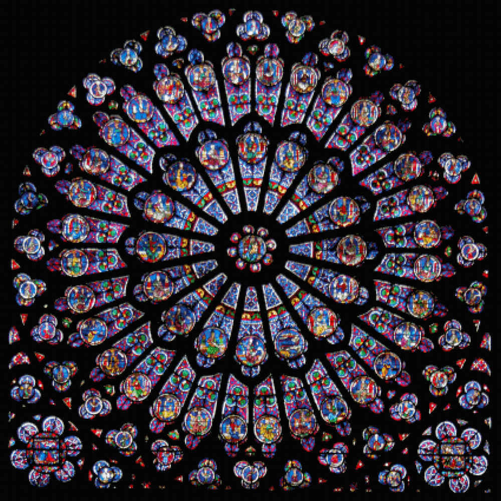 The north rose window of Notre Dame cathedral in Paris.  The window shows numerous scenes from the Old and New Testaments, but the finished work will be an impression of the window rather than detailed images. South Rose Window, Notre Dame, Paris is a companion piece. (About 1250).  The background is not stitched.  Use black fabric.