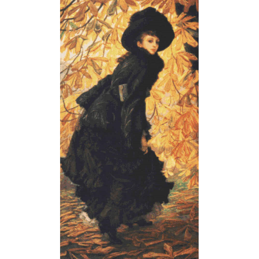 A young girl walking with a book under her arm in an elegant Victorian autumn costume.ย  She is all in black, wearing a black jacket with a fur collar over her black ruffled skirt, and with a black hat trimmed with black feathers or fur.ย  She contrasts beautifully with her background, a magnolia tree whose leaves have mostly turned golden yellow and are covering the ground underfoot. (1877) This pattern is solidly stitched. Any color fabric may be used.