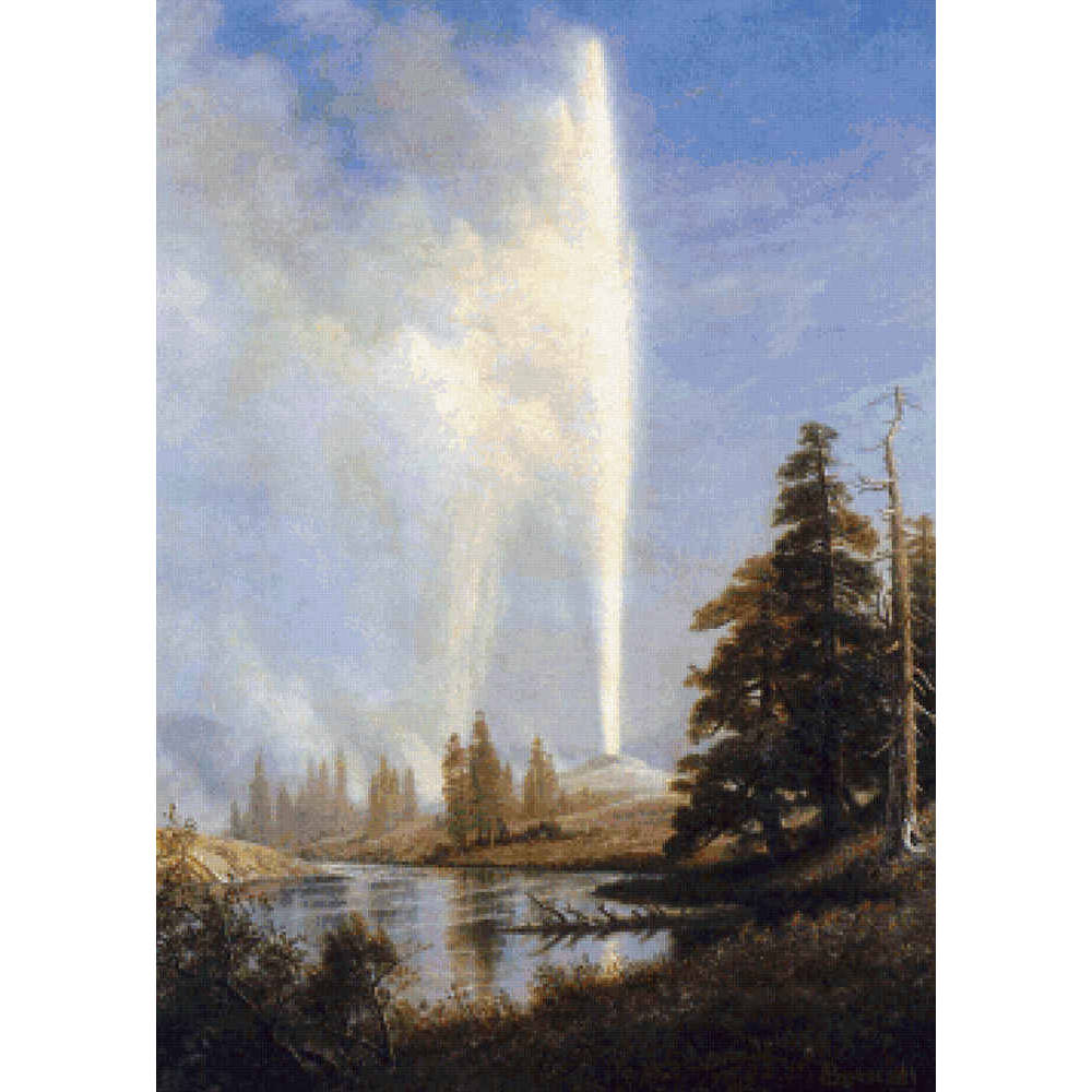 The Old Faithful geyser in Yellowstone National Park erupting and shooting boiling water into the air on a clear-skied day.  Part of the water is splashing into a small lake in which the geyser and nearby trees are reflected, while clouds of steam billow all around.  (Hudson River School, 1876) This pattern is solidly stitched. Any color fabric may be used.