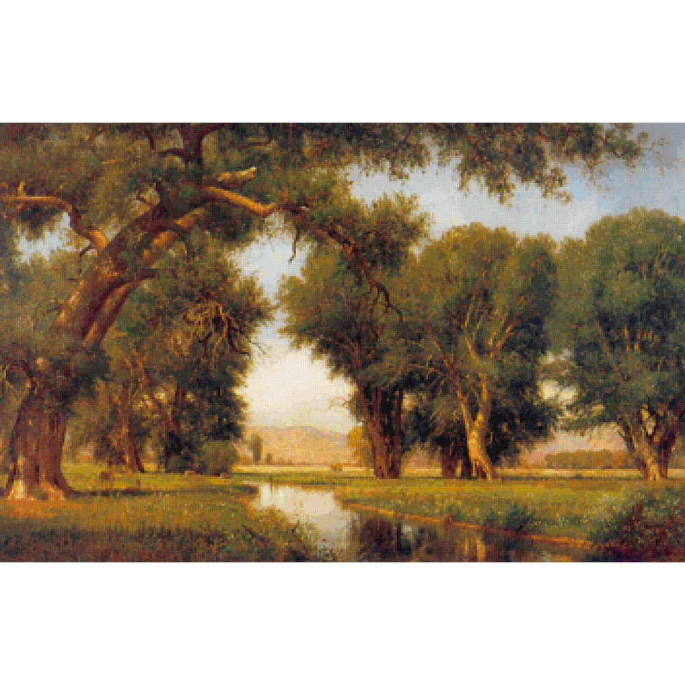 Massive cottonwood trees growing along the Cache La Poudre River where it crosses the plains below the Rocky Mountains, seen in the distance.ย  In the lush, flower-dotted grass, a few deer graze. (Hudson River School, 1876) This pattern is solidly stitched. Any color fabric may be used.