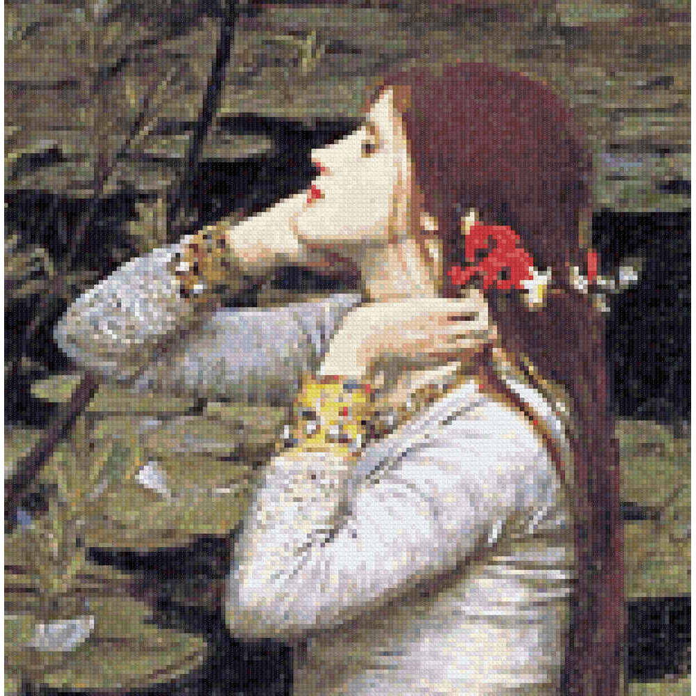 Ophelia, driven mad by her unrequited love for Hamlet, seated on a willow trunk overhanging a lake filled with water lilies, twining flowers into her long, loose hair.  She wears a white gown with gold jeweled cuffs.  This detail shows just her head and arms, but we also offer a pattern of the whole picture. (Pre-Raphaelite, 1894) This pattern is solidly stitched. Any color fabric may be used.
