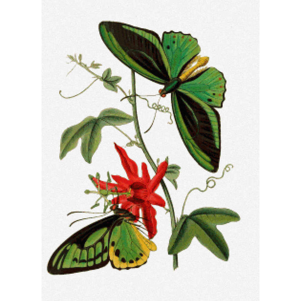 Two great bird-wing butterflies (native to New Caledonia) on a passion-flower.  The upper butterfly shows the pattern on the top of the wings; the lower shows the underside. The background is not stitched, and the pattern is designed for white fabric. (1848).