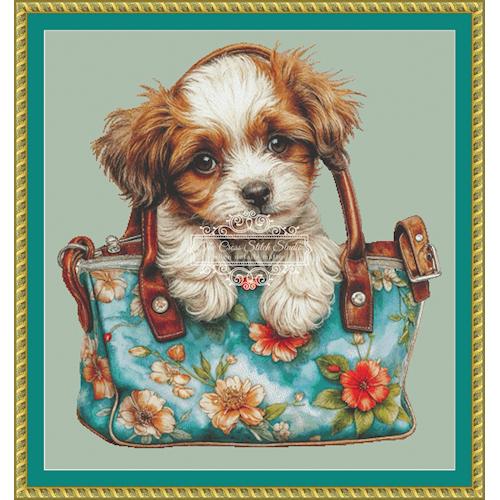 Our Penelope cross stitch pattern, adapted from art by digital artist Moonlit Songbird, features an adorable brown and cream puppy draped over a floral purse begging to tag along with her owner. Don’t let the size fool you – because there’s no background to stitch, the actual number of stitches is 129,296.