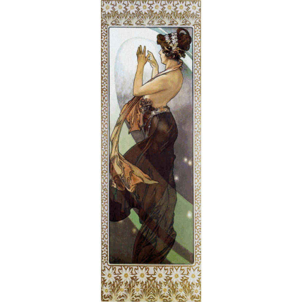 A lady representing the pole star dressed in a purple b gown with an orange scarf.  The background is rings with bright stars here and there.  Her face gives off a bright light.  A border of daisies surrounds her. We also offer a version without the floral border, as well as the others in the series, The Moon, Evening Star, and Morning Star.  (Art Nouveau, 1902).  This pattern is solidly stitched. Any color fabric may be used.