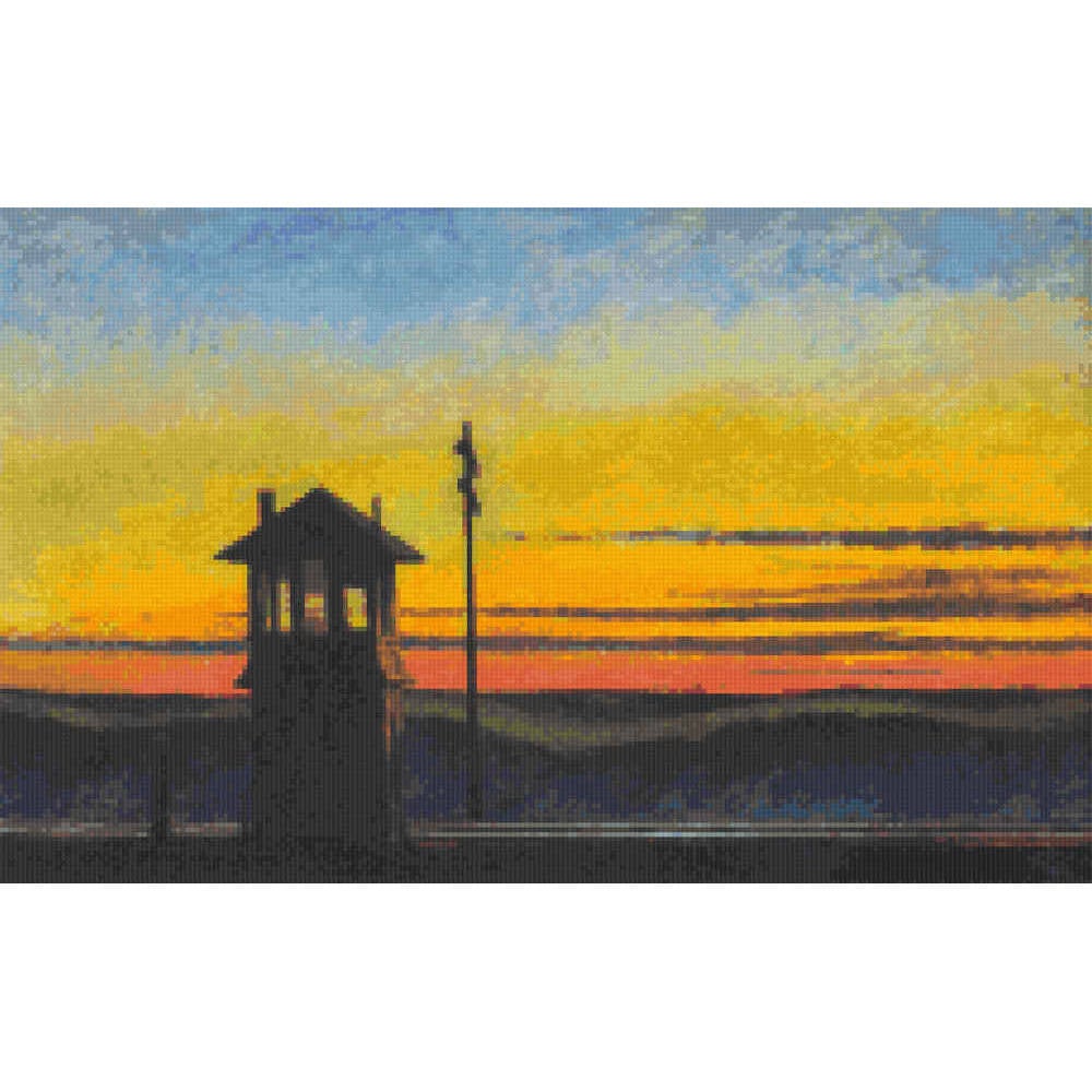 A spectacular sunset behind railroad tracks and a small building.  This pattern is solidly stitched. Any color fabric may be used.
