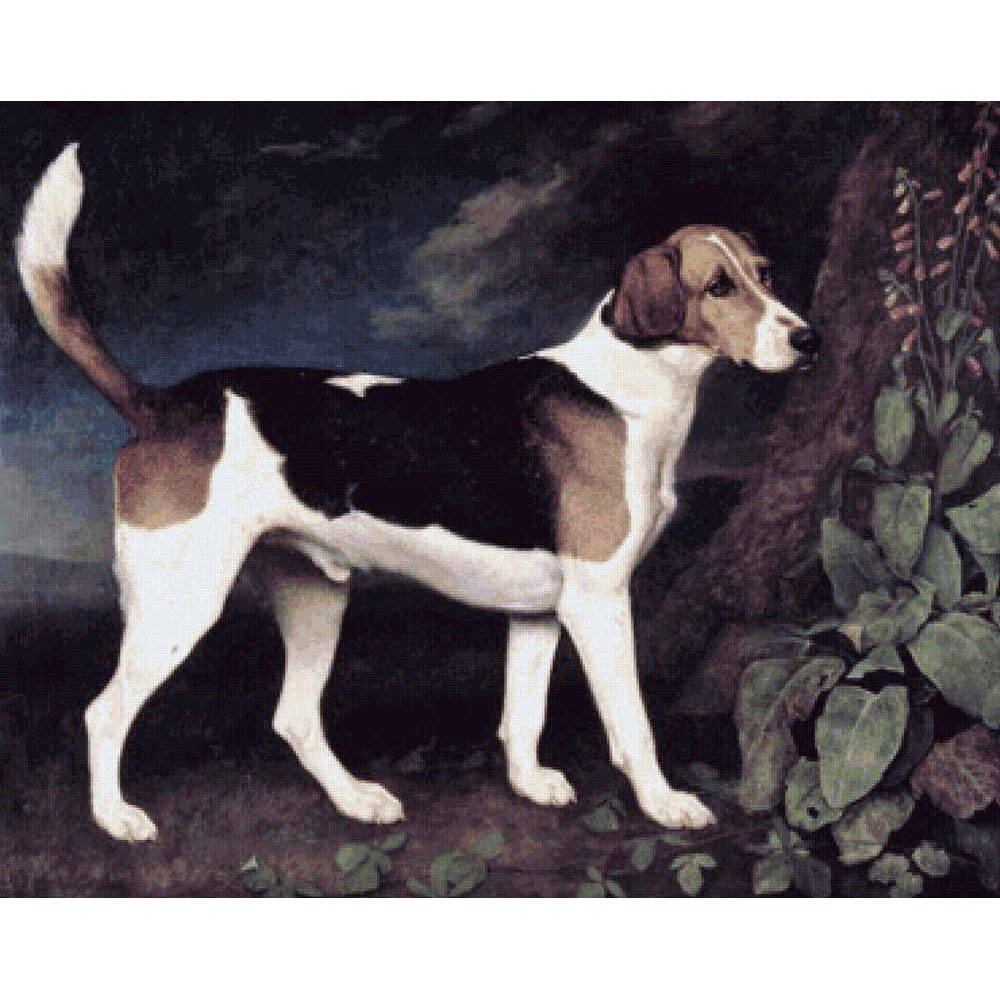 A portrait of a black, tan, and white foxhound in a dark landscape.  On the right, at the base of a tree, is a foxglove plant. (1792).  This pattern is solidly stitched. Any color fabric may be used.