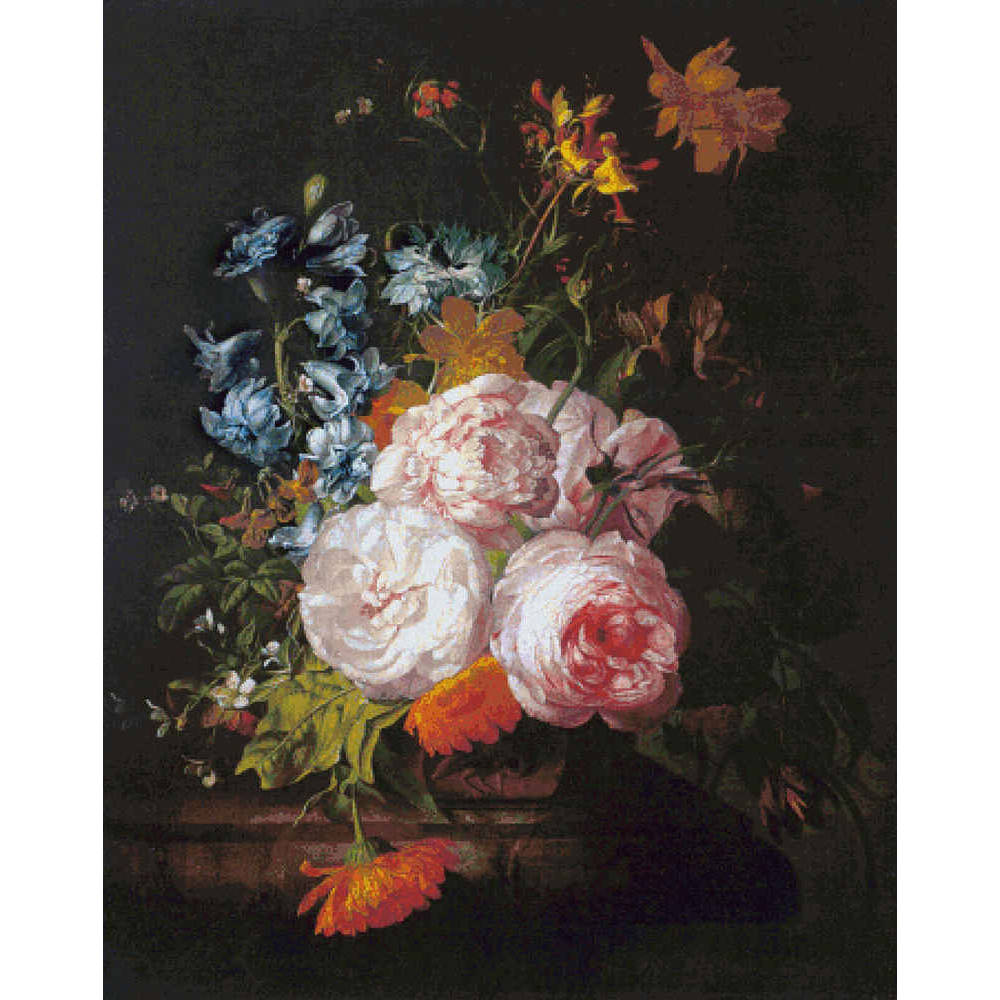 An arrangement of pink roses, blue hyacinths, marigolds, honeysuckle, and other flowers sitting on a marble ledge.  This pattern is solidly stitched. Any color fabric may be used.