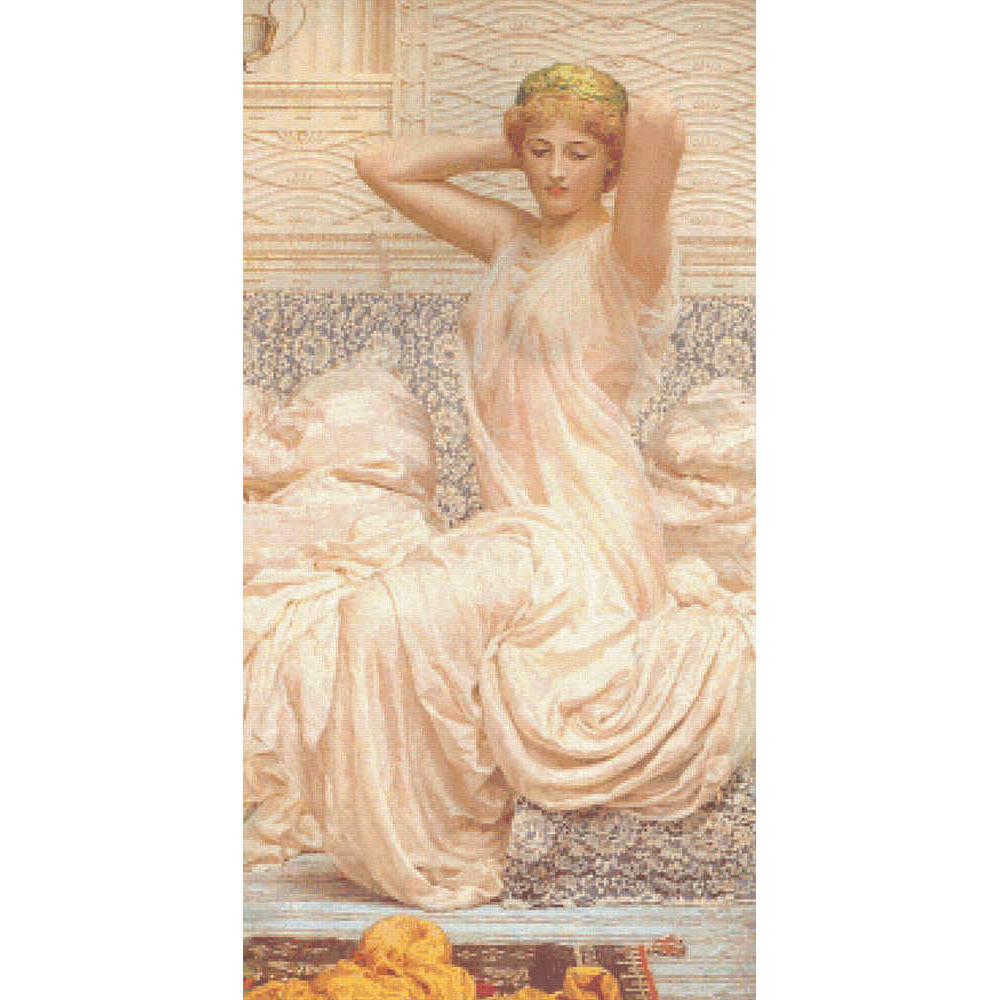 A young woman in a diaphanous white gown seated on a blue-and-white flowered couch.ย  Behind her is an ornately plastered white wall with Greek motifs, and on a ledge, a silver cup carries the silver theme forward.ย  The floor is also blue and white striped, and the only spots of color are the woman’s green cap and a yellow robe bunched up on the small red and brown Oriental rug. This pattern is solidly stitched. Any color fabric may be used.