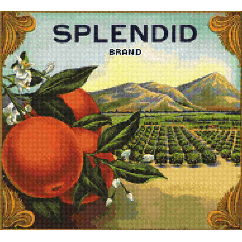 An orange crate label for Splendid brand oranges.  Inside an ornate gold frame are large oranges with glossy green leaves and white blossoms.  Behind them are sunlit mountains and orderly orange groves.  See UNK005-T for a version of the chart without the brand name. (about 1915) This pattern is solidly stitched.  Any color fabric may be used.