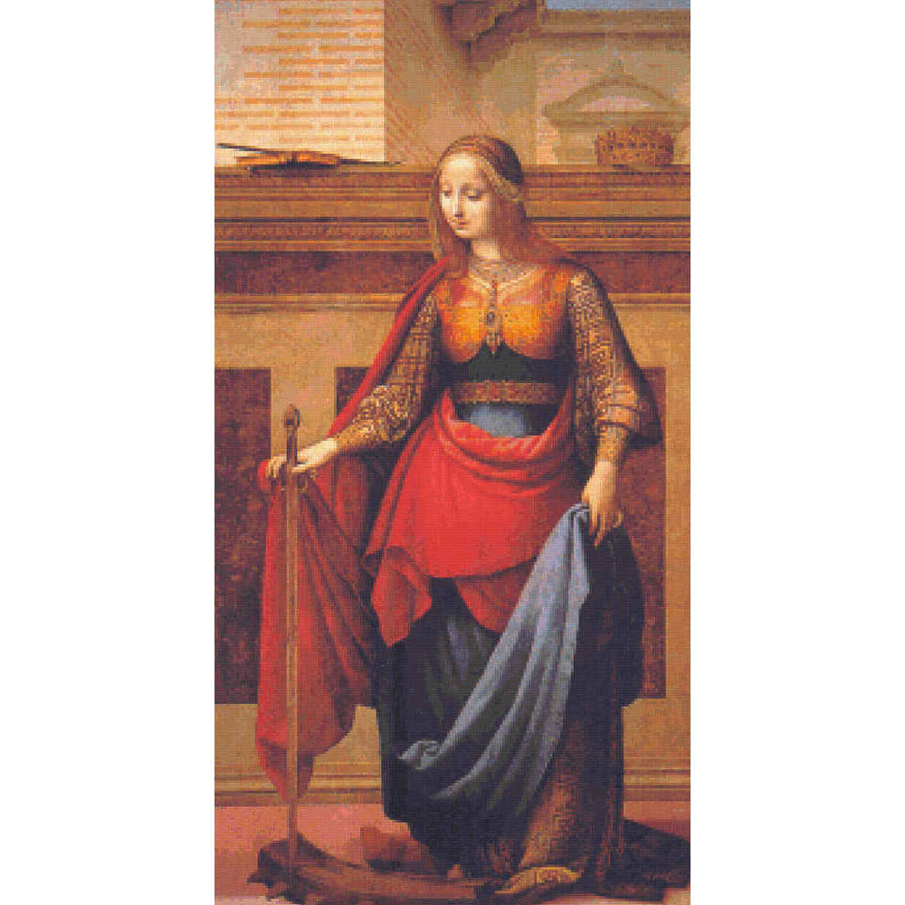 St. Catherine with a sword, broken wheel, and crown before a panel and brick wall.  This pattern is solidly stitched. Any color fabric may be used.