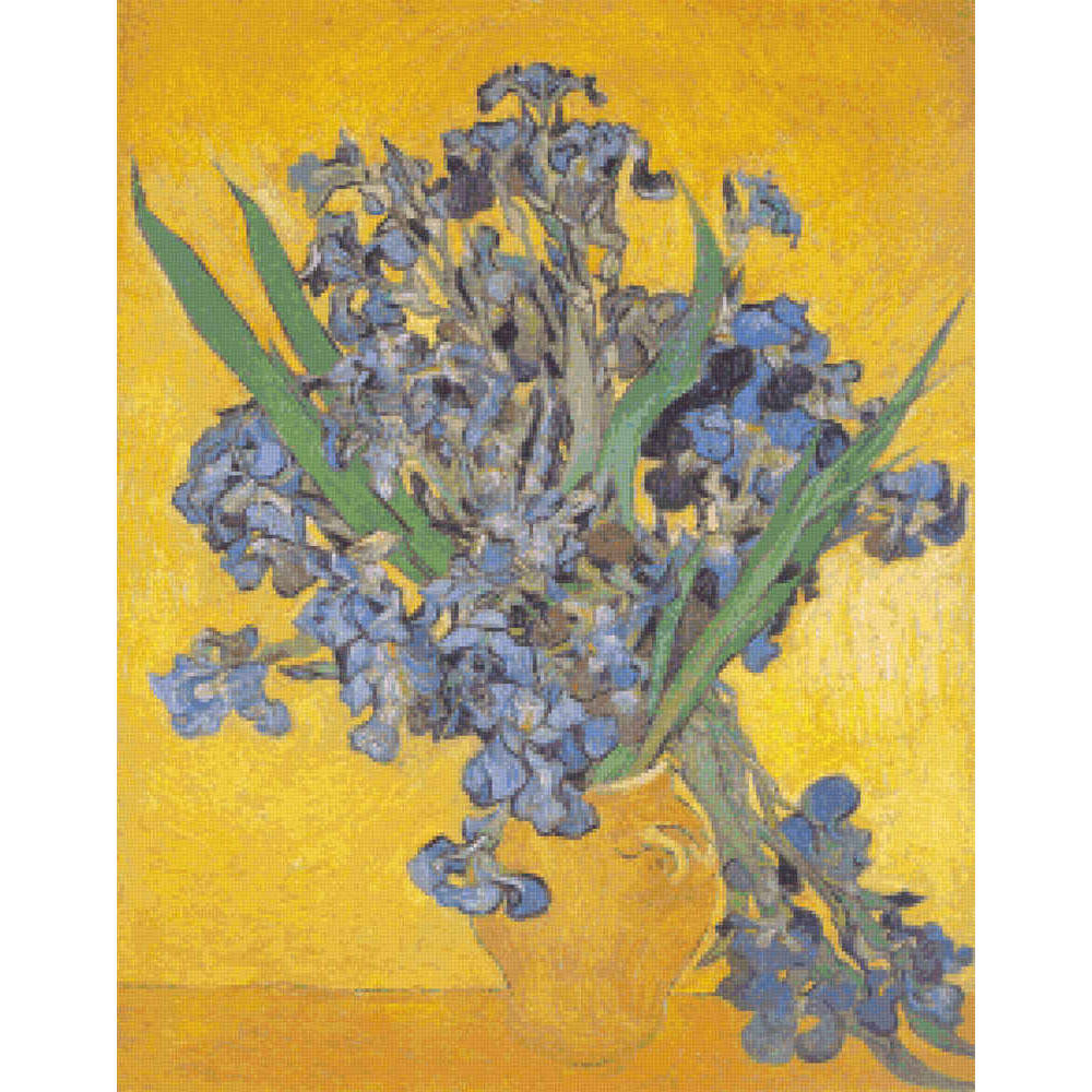 Powder-blue Japanese irises with a few blue-green leaves standing in a yellow clay pot against a starkly yellow background.  See VGO010 for a larger version (more stitches, more detail) of this pattern. (Post-Impressionist, 1890) This pattern is solidly stitched. Any color fabric may be used.