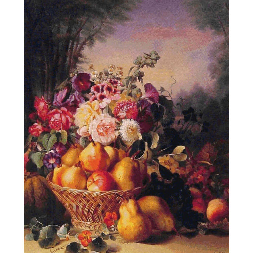 Ed on an 1861 painting depicting a wicker basket spilling over with ripe pears, apples, and blue, red, and white grapes and a melon.  Just behind the basket is a bouquet of red, pink, and yellow roses, pink and white chrysanthemums, hollyhocks, morning glories, nasturtiums, and other flowers.  In the background is a sketchily suggested woods and sunset. This pattern is solidly stitched. Any color fabric may be used.