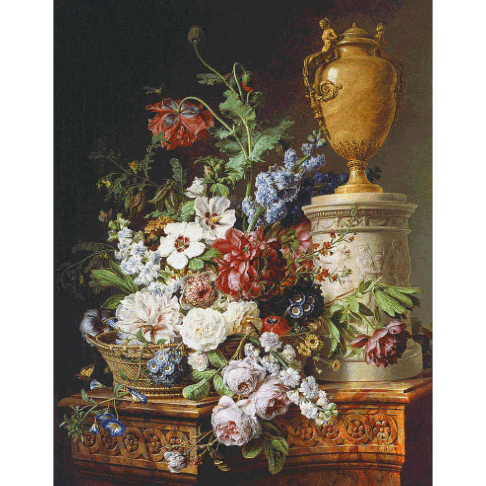 An elaborate arrangement of flowers spilling out of a shallow basket resting on a carved table.  Next to the flowers is a small marble column carved with Greek figures which is being used as a pedestal for an alabaster urn which has mermaid figures as handles.  The bouquet includes roses, peonies, poppies, delphiniums, hibiscus, morning glories, primroses, columbines, and other flowers.  There are also a couple of butterlies and other insects flitting about it.  (1787) This pattern is solidly stitched. Any color fabric may be used.