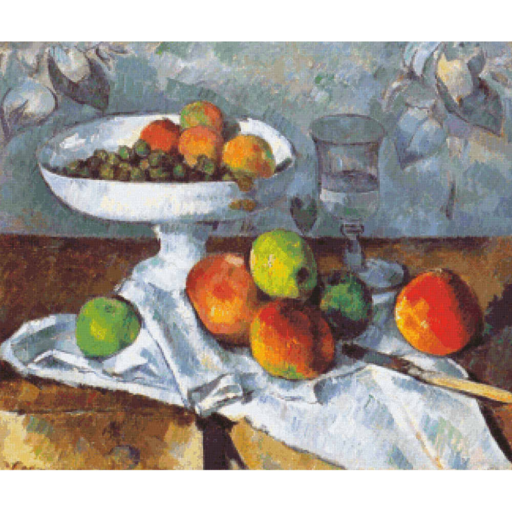 Green and red apples and green grapes with a white compote on a white cloth This pattern is solidly stitched. Any color fabric may be used.