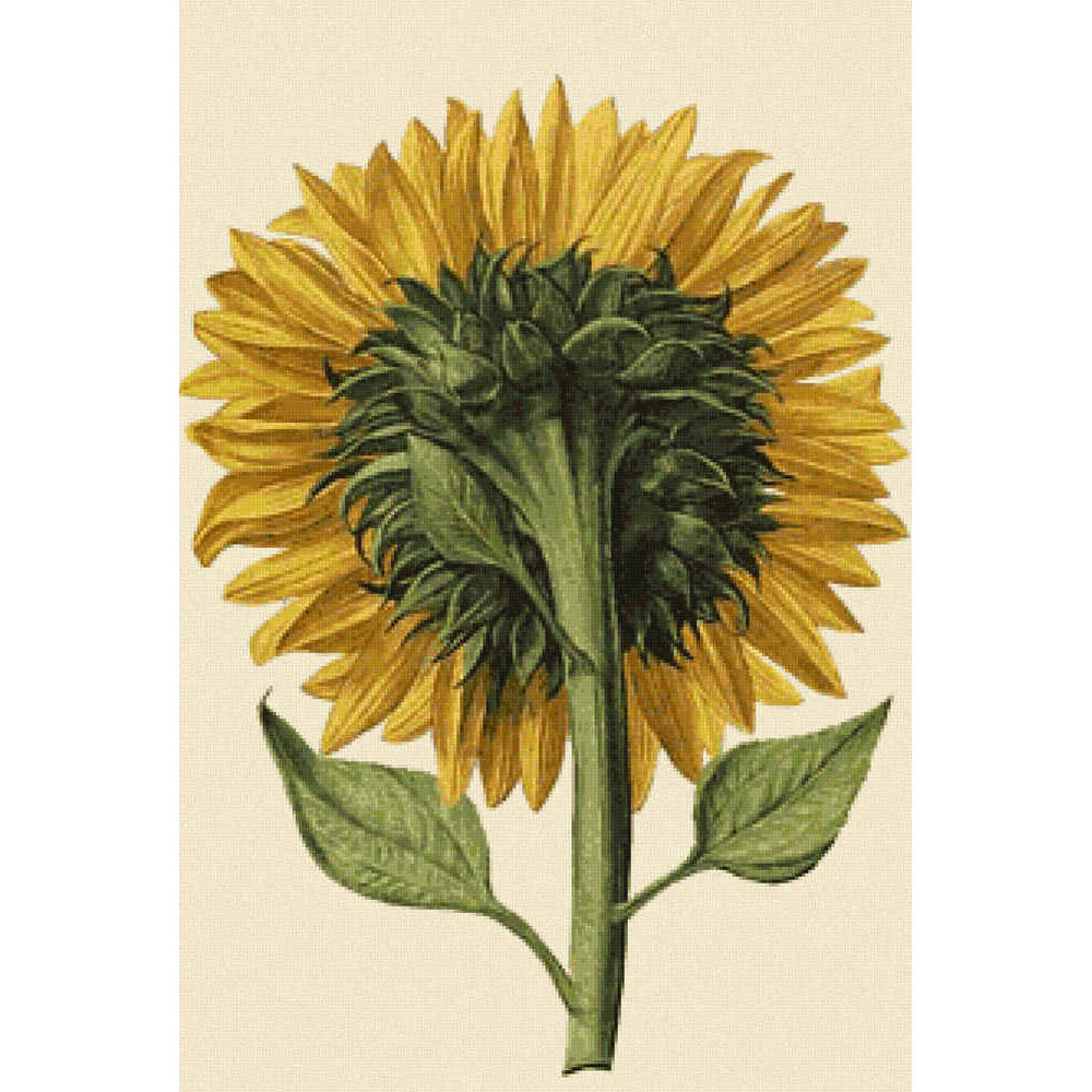 A botanical print of a sunflower viewed, unusually, from the back, showing the details of the calyx (sepals), the undersides of a few leaves, and the sturdy junction of stem and head.  The yellow petals form a fringe around the green calyx. This is the companion to Froeschl’s  Sunflower, which we also offer. (about 1600) Background is not stitched.  Use ecru fabric.