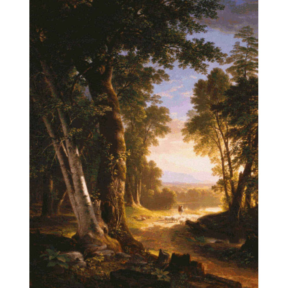Emerging from a dark beech grove, a shepherd and his flock head homeward at sunset. This pattern is solidly stitched. Any color fabric may be used.