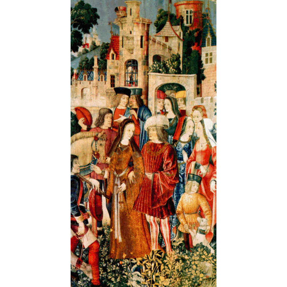 A portion of the tapestry “The Unicorn is Killed and Brought to the Castle” showing the seigneur and his lady with other nobles at the castle.  This pattern is solidly stitched. Any color fabric may be used.