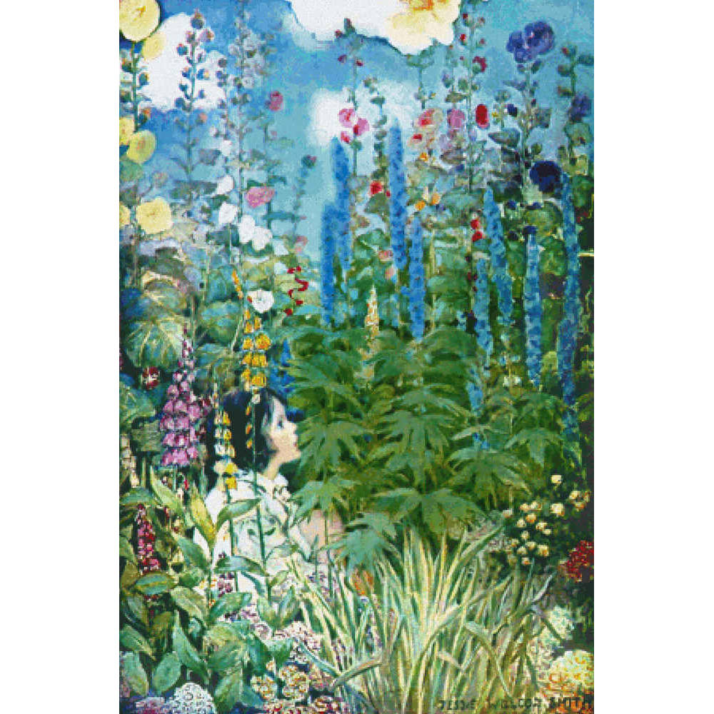 A young girl sitting amid flowers in an old-fashioned English garden gazing up at the many-colored flowers that tower over her.  Through the flowers a bright blue sky filled with white clouds can be seen. “All the names I know from nurse:/ Gardener’s garters, Shepherd’s purse,/ Bachelor’s buttons, Lady’s smock,/ And the Lady Hollyhock.” – Robert Louis Stevenson, A Child’s Garden of Verses. (The Golden Age of Illustration, 1905) This pattern is solidly stitched. Any color fabric may be used.