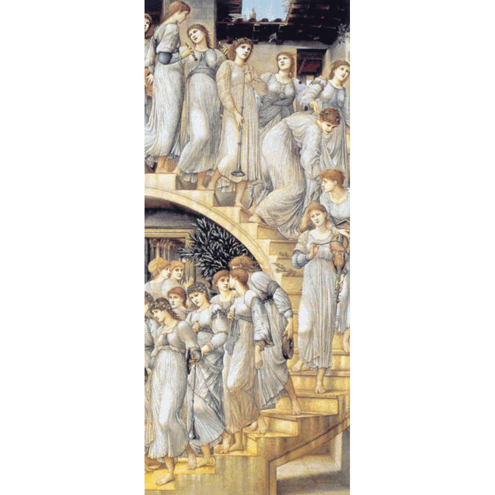 Girls in white tunics trimmed with blue and garlanded with laurel leaves descending an outdoor golden spiral staircase.  White doves perch on the edges of the roof above them.  They each carry a musical instrument, flutes, violins, trumpets, tambourines, dulcimers, and so on, and are seemingly about to enter a grand hall with golden columns. (Pre-Raphaelite, 1884) This pattern is solidly stitched. Any color fabric may be used.